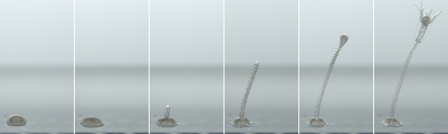 A planula larva of Clytia hemisphaerica undergoes metamorphosis: it settles, flattens, extends a stalk, and forms a zooid (gastrozooid). Live imaging reveals that the epithelial tissue of the metamorphosing polyp contracts rhythmically (~4 × 10⁻³ Hz; once every 4 min). These contractions generate bidirectional tissue flows and, eventually, luminal fluid flow within the gastrovascular cavity. Stalk elongation is coupled to the forward phase of the flow, and inhibition of muscle contraction with nifedipine blocks stalk elongation, indicating that rhythmic contraction mechanically drives tissue migration. In this project, we measure, test and model how fluid and cellular mechanical properties, together with their flow dynamics, generate morphogenetic forces.